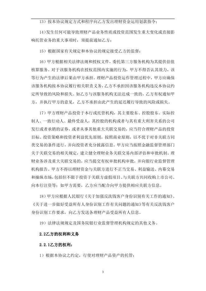 哈密市商业银行股份有限公司 人民币理财产品托管协议 (净值型-券商结算模式-统签) 合同编号: 甲方:哈密市商业银行股份有限公司 乙方:兴业银行股份有限公司 目录 第一章 协议当事人 ...................................................................................................................... 1 第二章 当事人的权利与义务 ...................................................................................................... 2 第三章 理财产品成立时理财资金及资料的交付 ......................................................................5 第四章 理财产品资产的保管 ...................................................................................................... 6 第五章 理财资金运用划款指令的确认与执行 ..........................................................................9 第六章 理财产品的投资交易及其资金清算 ............................................................................12 第七章 理财产品的会计核算 .................................................................................................... 15 第八章 理财产品托管档案的保存 ............................................................................................22 第九章 托管人对管理人的业务监督与核查 ............................................................................22 第十章 费用 ................................................................................................................................ 23 第十一章 信息披露 .................................................................................................................... 24 第十二章 理财产品变更、终止、清算与分配 ........................................................................26 第十三章 违约责任 .................................................................................................................... 27 第十四章 其他事项 .................................................................................................................... 27 1 鉴于哈密市商业银行股份有限公司(以下简称“甲方” )拟开展商业银行理 财业务设立多项理财产品,并委托兴业银行股份有限公司(以下简称“乙方”) 担任该等理财产品理财资产的托管人,为明确双方的权利、义务和责任,促进甲 方理财产品资产独立、安全、稳健运行,保障甲方理财产品投资者的合法权益, 根据《关于规范金融机构资产管理业务的指导意见》、《商业银行理财业务监督 管理办法》及其他相关规定,订立本托管协议。除非本协议另有明确定义,否则 本协议中涉及的理财业务专用名词的释义与法规或理财产品文件的释义相同。 本协议项下,乙方接受甲方委托,在甲方委托范围内,办理甲方交付的相关 资产的托管事宜。就该等委托托管事宜中双方当事人的权利、义务,乙方处理的 委托事项及相关职责,双方协商一致,在本协议中作出约定。 第一章 协议当事人 本协议由以下两方当事人签署: (一)管理人(甲方): 名称:哈密市商业银行股份有限公司 地址:哈密市天山南路8号 法定代表人:王黎群 联系人:柯如婷 联系电话:0991-7522672 (二)托管人(乙方): 名称:兴业银行股份有限公司 地址:福建省福州市湖东路154号 法定代表人:高建平 联系人:王添 联系电话:021-52629999 1 第二章 当事人的权利与义务 2.1甲方的权利与义务 2.1.1甲方的权利: 1)根据理财产品相关文件和本协议的有关约定,对理财产品进行管理、运 用、处置和分配; 2)根据本协议的有关规定向乙方发出理财产品的理财资金运用划款指令; 3)法律法规规定的其他权利。 2.1.2甲方的义务: 1)依法募集资金,办理理财产品份额的发售和登记事宜。 2)办理理财产品登记备案或者注册手续。 3)对所管理的不同理财产品单独管理、单独建账和单独核算,确保每只理 财产品具有资产负债表、利润表、产品净值变动表等会计报表。 4)按照《理财计划协议书》、《理财计划说明书》的约定确定收益分配方 案,及时向投资者分配收益。 5)进行理财产品会计核算并编制理财产品财务会计报告。 6)依法计算并披露理财产品净值或者投资收益情况,确定申购、赎回价格。 7)按照法律法规、国务院银行业监督管理机构的规定及理财文件的约定办 理与理财产品管理业务活动有关的信息披露事项。 8)保存理财产品财产管理业务活动的记录、账册、报表和其他相关资料。 9)以管理人名义,代表投资者利益行使诉讼权利或者实施其他法律行为。 10)在兑付理财产品资金及收益时,甲方应当保证理财产品资金及收益返回 委托人的原账户、同名账户或者合同约定的受益人账户。 11)协助乙方为甲方理财产品开立托管所需的资金账户以及相关的资产账户; 12)按照本协议规定将理财资金或资产移交乙方托管; 2 13)按本协议规定方式和程序向乙方发出理财资金运用划款指令; 14)发生任何可能导致理财产品业务性质或投资范围发生重大变化或直接影 响托管业务的重大事项时,须提前通知乙方; 15)根据国家有关规定和本协议的规定接受乙方的监督; 16)甲方根据相关法律法规和授权文件,委托第三方服务机构为其提供估值 核算服务。对于该服务机构在授权范围内实施的行为,甲方不得否认其效力,该 等行为产生的法律后果由甲方承担。理财产品投资运作管理过程中,甲方应确保 该服务机构按本协议履行相关职责义务,乙方不承担因该服务机构违反本协议约 定所导致的风险和