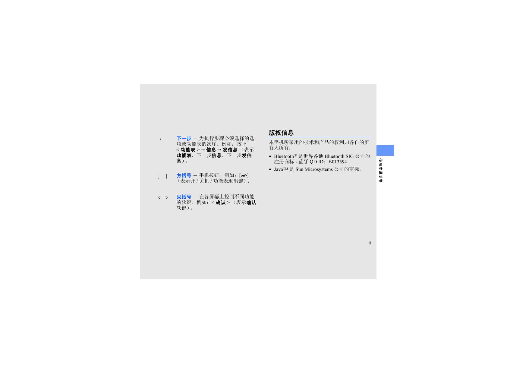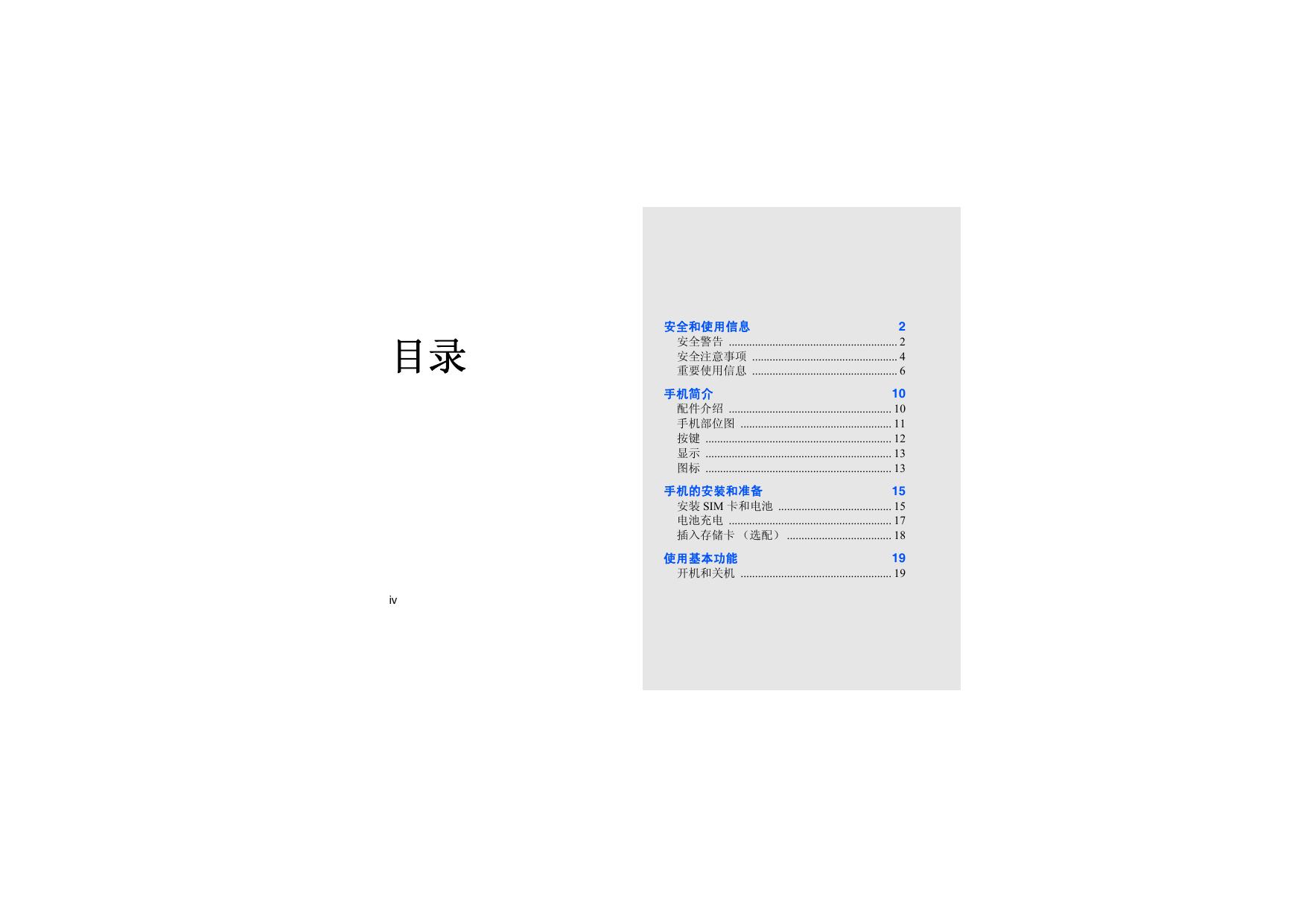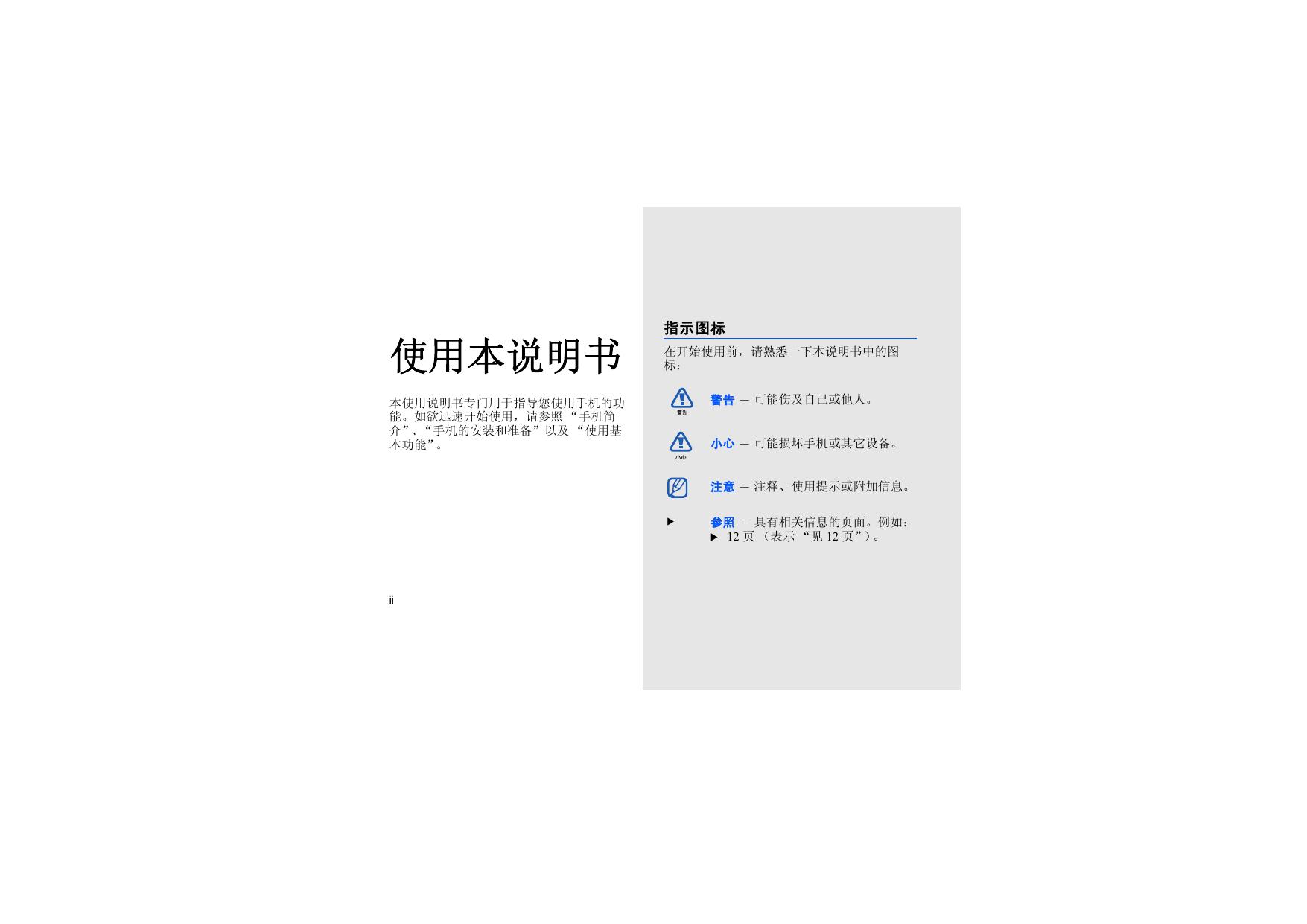 SGH-J708 使用说明书 指示图标 使用本说明书 本使用说明书专门用于指导您使用手机的功 能。如欲迅速开始使用,请参照 “手机简 介”、“手机的安装和准备”以及 “使用基 本功能”。 在开始使用前,请熟悉一下本说明书中的图 标: 警告 — 可能伤及自己或他人。 小心 — 可能损坏手机或其它设备。 注意 — 注释、使用提示或附加信息。 参照 — 具有相关信息的页面。例如: 12 页 (表示 “见 12 页”)。 ii 版权信息 本手机所采用的技术和产品的权利归各自的所 有人所有: • Bluetooth® 是世界各地 Bluetooth SIG 公司的 注册商标 - 蓝牙 QD ID:B013594 • Java™ 是 Sun Microsystems 公司的商标。 [ ] < > 方括号 — 手机按钮。例如:[ ] (表示开 / 关机 / 功能表退出键)。 尖括号 — 在各屏幕上控制不同功能 的软键。例如:< 确认 > (表示确认 软键)。 iii 使用本说明书 下一步 — 为执行步骤必须选择的选 项或功能表的次序。例如:按下 < 功能表 > → 信息 → 发信息 (表示 功能表,下一步信息,下一步发信 息)。 → 安全和使用信息 目录 2 安全警告 .......................................................... 2 安全注意事项 .................................................. 4 重要使用信息 .................................................. 6 手机简介 10 配件介绍 ........................................................ 10 手机部位图 .................................................... 11 按键 ................................................................ 12 显示 ................................................................ 13 图标 ................................................................ 13 手机的安装和准备 15 安装 SIM 卡和电池 ....................................... 15 电池充电 ........................................................ 17 插入存储卡 (选配) .................................... 18 使用基本功能 19 开机和关机 .................................................... 19 iv 使用高级功能 30 使用高级通话功能 .........................................30 使用高级通信录功能 .....................................32 使用高级信息功能 .........................................33 使用高级音乐功能 .........................................34 使用工具和应用程序 36 编写和发送 SOS 信息 ................................... 39 录制和播放语音备忘录 ................................ 39 编辑图片 ........................................................ 40 使用 Java 游戏和应用程序 ........................... 42 查看世界时间 ................................................ 43 设定和使用闹钟 ............................................ 43 使用计算器 .................................................... 44 货币或长度等基本换算 ................................ 45 设定定时器 .................................................... 45 使用秒表 ........................................................ 45 编写文字备忘录 ............................................ 45 管理日历 ........................................................ 46 功能表功能 a 故障排除 b 目录 使用功能表 .....................................................20 根据需要设定手机 .........................................20 使用基本通话功能 .........................................21 发送和查看信息 .............................................22 添加和查找联系人 .........................................25 使用照相机基本功能 .....................................26 收听音乐 .........................................................27 浏览 Web ........................................................29 使用中国移动服务 .........................................36 使用蓝牙无线功能 .........................................38 v 安全警告 安全和使用信 息 将手机放在儿童和宠物接触不到的地方 遵守下列注意事项,以免出现危险或非法情 况,并确保手机性能最佳。 保护听力 将手机及其零配件放在儿童或宠物接触不到的 地方。儿童或宠物可能吞下小零件导致窒息或 重伤。 以非常高的音量用耳机收听可能会损 坏您的听力。可以使用通话或音乐所 需的最小音量设置。 2 避免干扰起搏器 确保将手机或相关设备安装在固定牢固的车辆 中。不可将手机和配件安放于气囊张开区域里 或附近。无线设备安装不当时,如果气囊迅速 膨胀,会导致严重损伤。 制造商和无线技术研究部门建议在手机和起搏 器之间必须至少保持 15cm (6 英寸)的距离, 以避免可能对起搏器造成的干扰。如果您怀疑 手机对起搏器或其它医疗设备有干扰,应立即 关闭手机,并与起搏器或医疗设备制造商联 系,寻求指导。 小心处理和处置电池和充电器 • 只能使用三星公司允许使用的专为手机设计 的电池和充电器。不兼容的电池和充电器可 能造成重伤或损坏手机。 • 不要把电池扔到火里。耗尽的电池要按照当 地的法规处理。 • 不要将电池或手机放在加热设备的周围。例 如微波炉、烤箱或散热器的里面或上部。电 池过热可能爆炸。 在可能发生爆炸的环境下关闭手机 在加油站 (维修站)或靠近易燃物品、化学制 剂的地方,请勿使用手机。在警告标志或说明 要求时关闭手机。在燃油或化学制剂存放和运 输区或易爆场所内或周围,手机可能引起爆炸 或起火。不可在放有手机、手机零件或附件的 箱子中存放或携带易燃液体、气体或爆炸物。 • 不要挤压或刺扎电池。不要让电池受到外部 高压,否则可能导致内部短路或过热现象。 3 安全