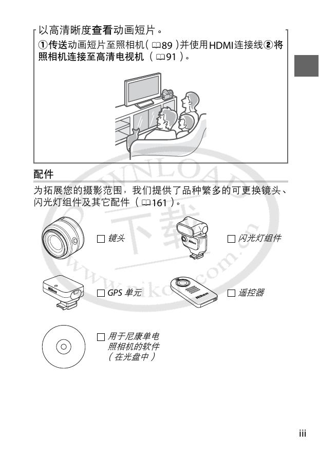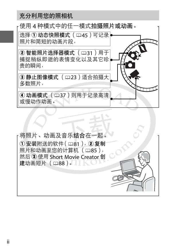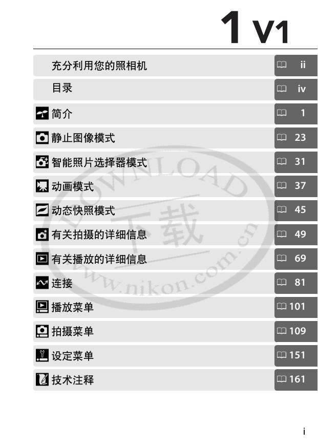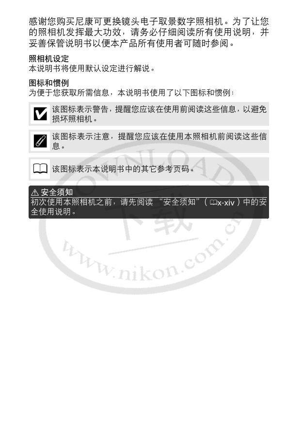 可更换镜头电子取景数字照相机 使用说明书 出版日期 2011 年 9 月 1 日 在中国印刷 Ck SB1I04(15) 6MVA0115-04 SG02 Ck 感谢您购买尼康可更换镜头电子取景数字照相机。为了让您 的照相机发挥最大功效,请务必仔细阅读所有使用说明,并 妥善保管说明书以便本产品所有使用者可随时参阅。 照相机设定 本说明书将使用默认设定进行解说。 图标和惯例 为便于您获取所需信息,本说明书使用了以下图标和惯例: D 该图标表示警告,提醒您应该在使用前阅读这些信息,以避免 损坏照相机。 A 该图标表示注意,提醒您应该在使用本照相机前阅读这些信 息。 0 该图标表示本说明书中的其它参考页码。 A 安全须知 初次使用本照相机之前,请先阅读 “安全须知”(0x-xiv)中的安 全使用说明。 充分利用您的照相机 0 ii 目录 0 iv s 简介 0 1 z 静止图像模式 0 23 8 智能照片选择器模式 0 31 y 动画模式 0 37 9 动态快照模式 0 45 t 有关拍摄的详细信息 0 49 I 有关播放的详细信息 0 69 Q 连接 0 81 o 播放菜单 0 101 i 拍摄菜单 0 109 g 设定菜单 0 151 n 技术注释 0 161 i 充分利用您的照相机 使用 4 种模式中的任一模式拍摄照片或动画。 选择 q 动态快照模式 (0 45)可记录 照片和简短的动画片段, w 智能照片选择器模式 (0 31)用于 捕捉稍纵即逝的表情变化以及其它珍 贵的瞬间, e 静止图像模式 (0 23)适合拍摄大 多数照片, r 动画模式 (0 37)则用于记录高清 或慢动作动画。 将照片、动画及音乐结合在一起。 q 安装附送的软件(0 81),w 复制 照片和动画至您的计算机 (0 85), 然后 e 使用 Short Movie Creator 创 建动画短片 (0 88)。 ii 以高清晰度查看动画短片。 q传送动画短片至照相机(0 89)并使用 HDMI 连接线w将 照相机连接至高清电视机 (0 91)。 配件 为拓展您的摄影范围,我们提供了品种繁多的可更换镜头、 闪光灯组件及其它配件 (0 161)。 镜头 闪光灯组件 GPS 单元 遥控器 用于尼康单电 照相机的软件 (在光盘中) iii 目录 充分利用您的照相机 .........................................................ii 配件 ....................................................................................................iii 目录 .................................................................................iv 安全须知 ........................................................................... x 声明 ................................................................................xv 简介 ....................................................................................1 包装内物品 .......................................................................1 照相机部件 .......................................................................2 照相机机身 ....................................................................................... 2 显示屏................................................................................................ 4 $ (显示)按钮 ....................................................................... 5 模式拨盘 ........................................................................................... 7 多重选择器 ....................................................................................... 8 & (特色功能)按钮 .................................................................... 9 G 按钮 ....................................................................................... 10 开始步骤 .........................................................................12 静止图像模式 ....................................................................23 在静止图像模式下拍摄照片 ............................................23 查看照片 .........................................................................28 删除照片 ......................................................................................... 29 智能照片选择器模式 .........................................................31 在智能照片选择器模式下拍摄照片 ..................................31 查看照片 .........................................................................34 选择最佳拍摄 ................................................................................ 34 删除照片 ......................................................................................... 35 iv 动画模式 ...........................................................................37 HD 动画 ..........................................................................37 慢动作 ............................................................................40 查看动画 .........................................................................42 删除动画 ......................................................................................... 43 动态快照模式 ....................................................................45 在动态快照模式下拍摄 ...................................................45 查看动态快照 ..................................................................48 删除动态快照 ................................................................................ 48 有关拍摄的详细信息 .........................................................49 自拍及遥控模式 ..............................................................49 对焦模式 .........................................................................52 手动对焦 ......................................................................................... 55 曝光补偿 .........................................................................57 闪光拍摄 .........................................................................59 安装闪光灯组件 ..................................