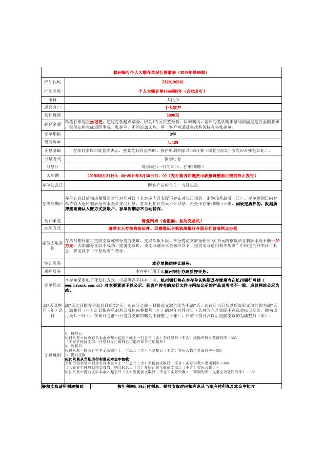 杭州银行个人大额存单发行要素表(2019年第69期) 产品代码 PA20196936 产品名称 个人大额存单1969期3年(合肥分行) 币种 人民币 适合客户 个人客户 发行规模 5000万 起存金额 单笔存单起点20万元,超过存款起点部分,应为1万元的整数倍。认购期内,客户每笔认购申请均需满足起存金额要求 ,每笔认购完成后即生成一张存单,不得追加认购。单一客户可通过多次购买持有多张存单。 存单期限 3年 票面利率 4.13% 计息基础 存单利率以年收益率表示,换算为日收益率时,按存单利率除以365计算(即使当年2月份为29天亦是如此)。 付息方式 按季付息 付息日 每季最后一月的21日、存单到期日 认购期 2019年5月31日9:00-2019年6月30日17:00(发行期内如遇货币政策调整则可提前终止发行) 存单起息日 即客户认购当日,当日起息 存单起息日后相应期限的对年对月对日(若对应当月实际不存在对应日期的,则为该月最后一日)。存单到期日向存 存单到期日 单持有人返还剩余全部本金并支付利息,存单到期日当天不计利息。资金于存单到期日入账,如设定质押的,根据质 押规则确认入账方式及账户。存单到期后不自动转存。 发行渠道 营业网点(含柜面、自助交易机) 办理方式 请带本人有效身份证件、西湖借记卡到杭州银行合肥分行营业网点办理 存单到期日前可提前支取或部分提前支取,支取次数不限。部分提前支取金额应为1万元的整数倍且剩余本金不低于20 提前支取条 万元,否则部分支取不成功。提前支取时,该支取部分本金按照以下“提前支取适用利率规则”中约定的利率计付利 款 息,详见以下“计息规则”部分。 转让服务 本存单提供转让服务。 质押服务 本存单可用于在杭州银行办理质押业务。 本存单采用电子化发行方式,可提供存单持有证明。杭州银行将在本存单认购期及存续期内在杭州银行网站( 存单凭证 www.hzbank.com.cn)对本要素表予以公示,若客户持有的发行文件与网站公示的产品说明书不一致,应以网站公示为 准。 满7天及整 满7天之日指存单起息日后第7天,在该日之前一日提前支取的即为不满7天,在该日当日及以后提前支取的即为满7天 月(年)之 。满整月(年)之日指存单起息日后相应整数月(年)的对年对月对日(若对应当月实际不存在对应日期的,则为该 日 月最后一日),在该日之前一日提前支取的即为不满整月(年),在该日当日及以后提前支取的为满整月(年)。 计息规则 A、付息日 应付利息=持有存单本金余额×起息日或上一付息日(含)至付息日(不含)实际天数×票面利率÷365 (因允许提前支取,付息日支付的利息可能存在多付的情形) B、到期日 应付利息=持有存单本金余额×上一付息日(含)至到期日(不含)实际天数×票面利率÷365 C、提前支取 应扣利息从当期应付利息及本金中扣收 当期应付利息=提前支取本金×上一付息日(含)至提前支取日(不含)实际天数×票面利率÷365 (若在首个付息日前支取的,则自起息日(含)开始计算至提前支取日(不含)实际天数。) 应扣利息=提前支取本金×起息日(含)至提前支取日(不含)实际天数×(票面利率-提前支取适用利率)÷365 提前支取适用利率规则 按年利率0.3%计付利息,提前支取时应扣利息从当期应付利息及本金中扣收