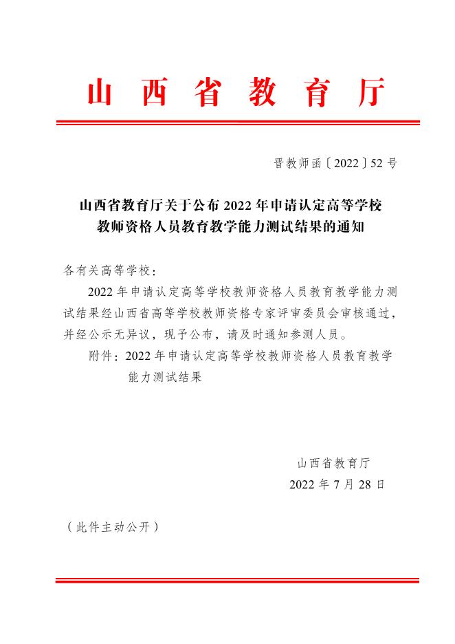 山西省教育厅关于公布2022年申请认定高等学校教师资格人员教育教学能力测试结果的通知.pdf