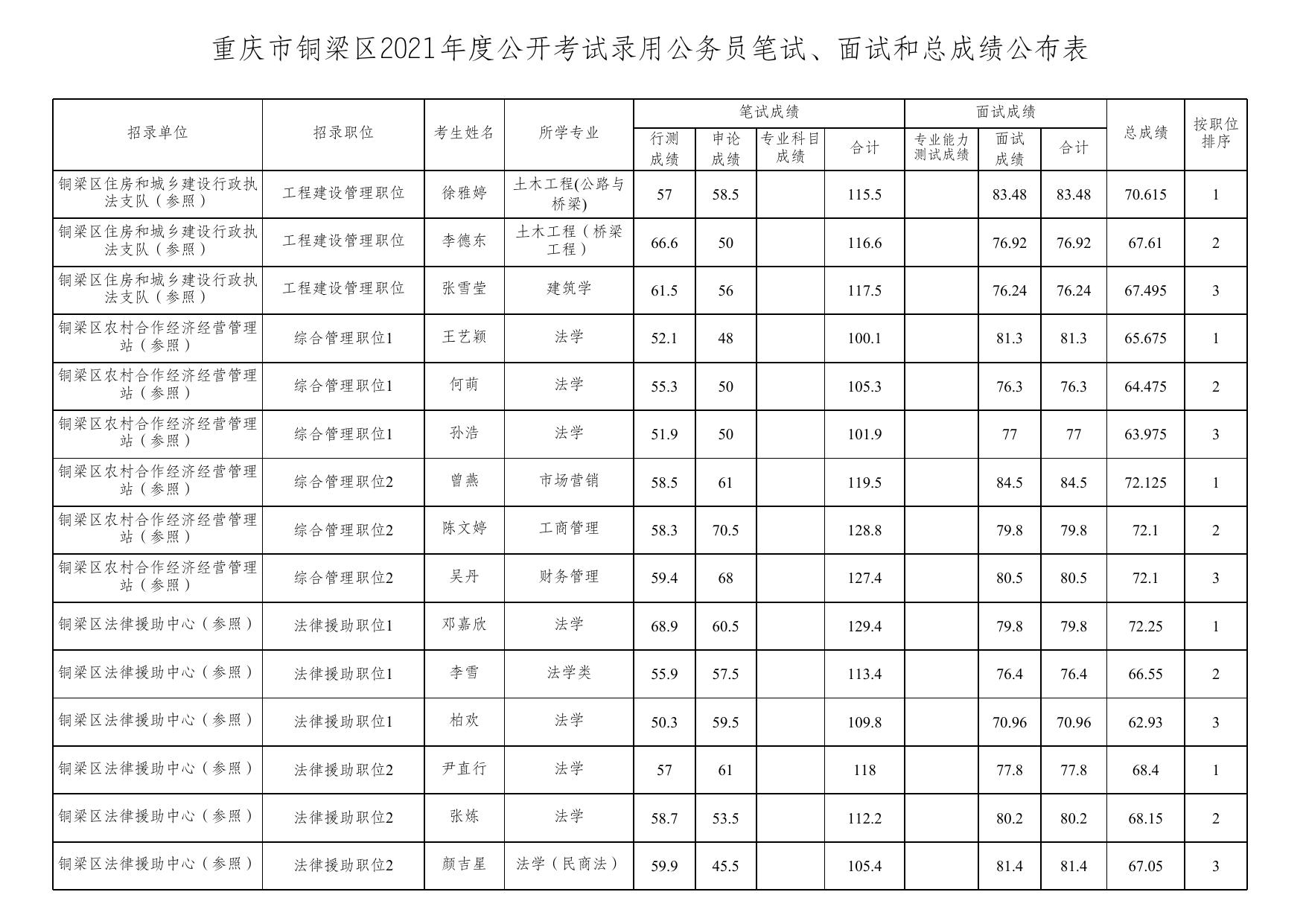 重庆市铜梁区2021年度公开考试录用公务员笔试、面试和总成绩公布表.xlsx