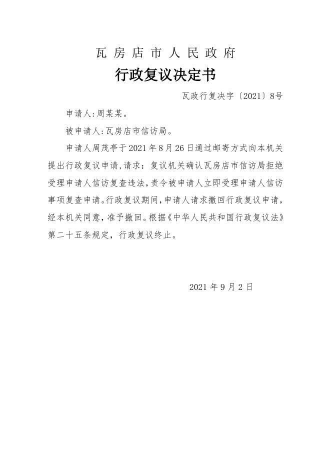 瓦政行复决字〔2021〕8号申请人瓦房店市信访局信访诉求案.doc