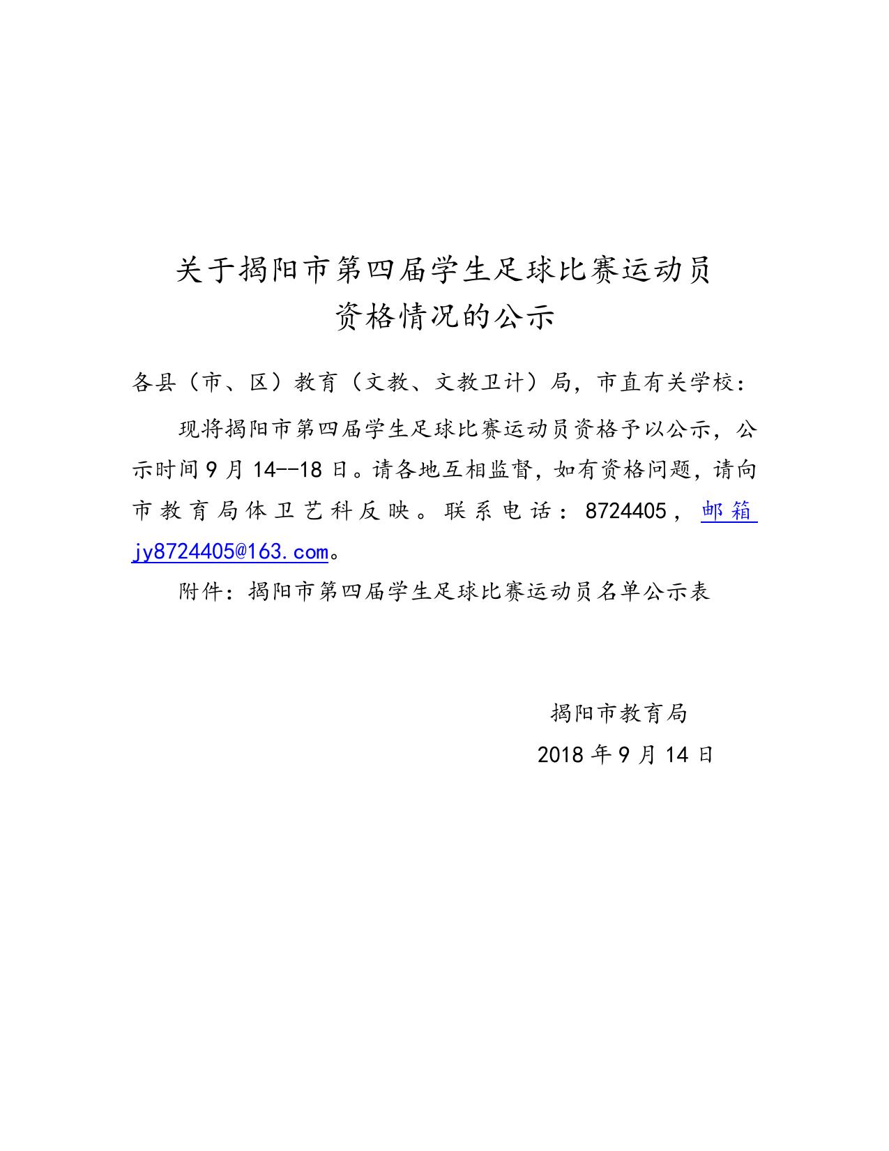 关于揭阳市第四届学生足球比赛运动员资格情况的公示-公示公告.docx