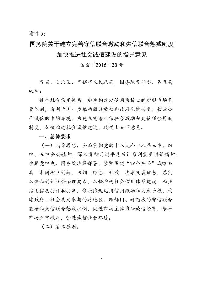 附件5:国务院关于建立完善守信联合激励和失信联合惩戒制度加快推进社会诚信建设的指导意见国发〔2016〕33号.docx