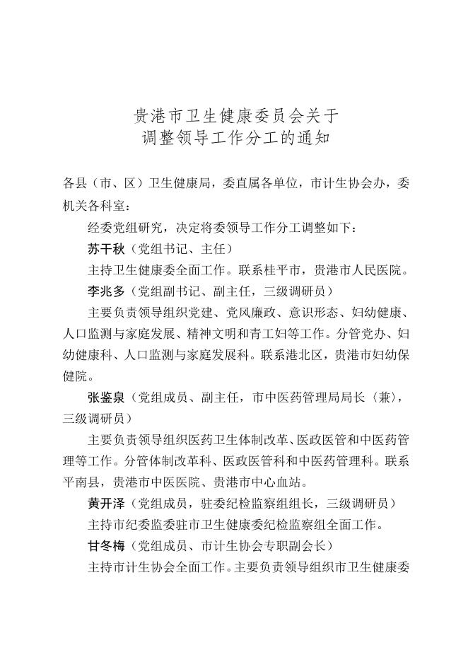 贵港市卫生健康委员会关于调整领导工作分工的通知.doc
