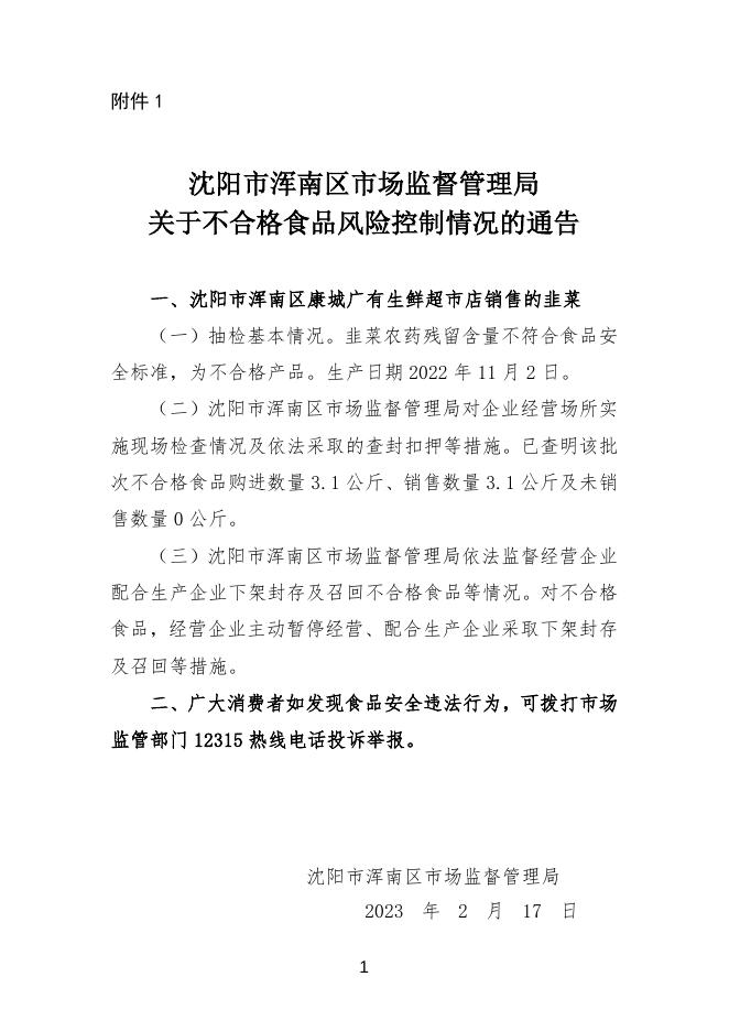 沈阳市浑南区康城广有生鲜超市店销售的韭菜不合格核查处置信息通告.doc