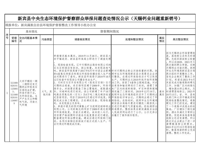 新宾县轮中央生态环境保护督察群众举报问题查处情况公示(天赐钙业重新销号)(1).xlsx
