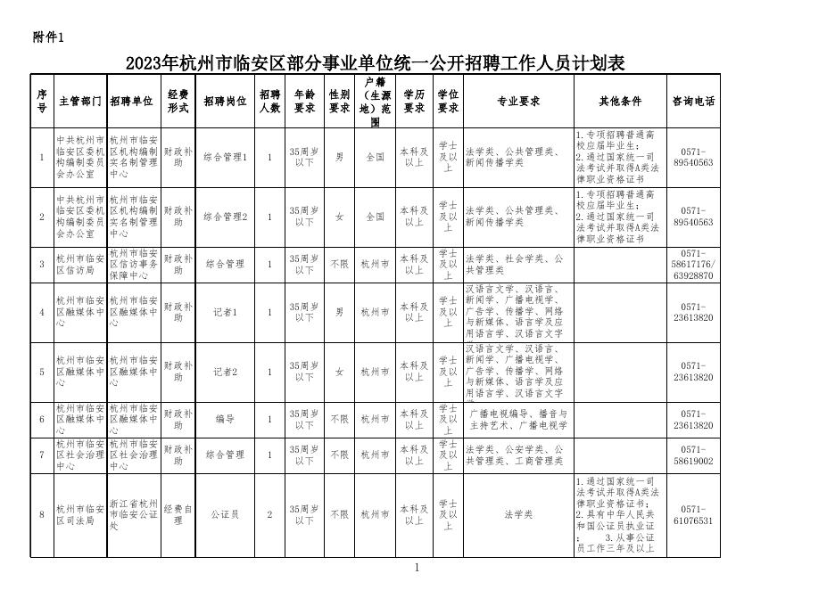 附件1:2023年杭州市临安区部分事业单位统一公开招聘工作人员计划表 .xls