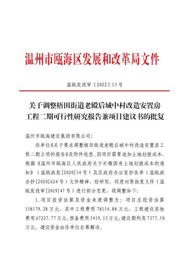 附件下载:温瓯发改审〔2022〕13 号关于调整梧田街道老殿后城中村改造安置房 工程二期可行性研究报告兼项目建议书的批复.pdf