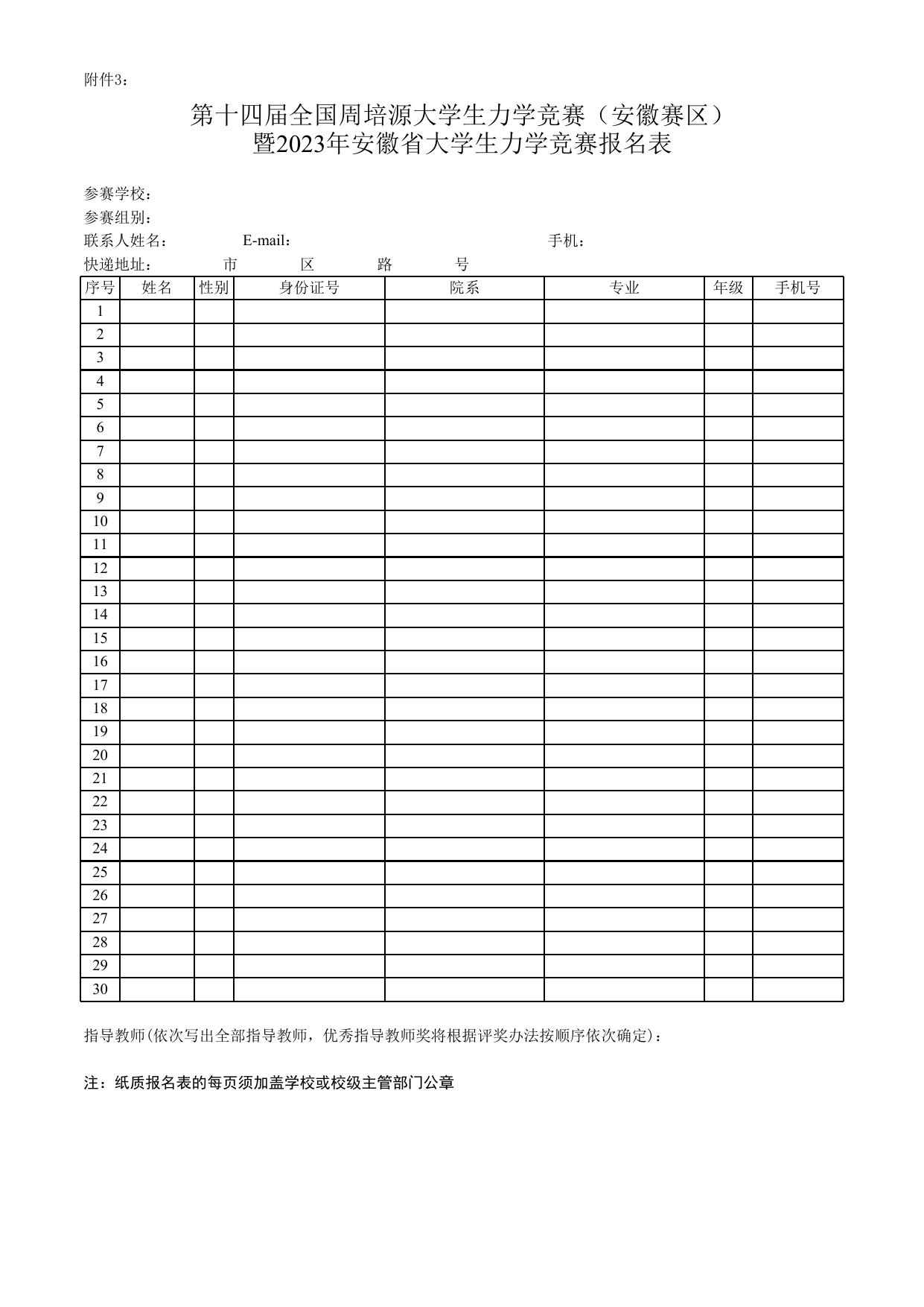 附件3:第十四届全国周培源大学生力学竞赛(安徽赛区)暨2023年安徽省大学生力学竞赛报名表.xls