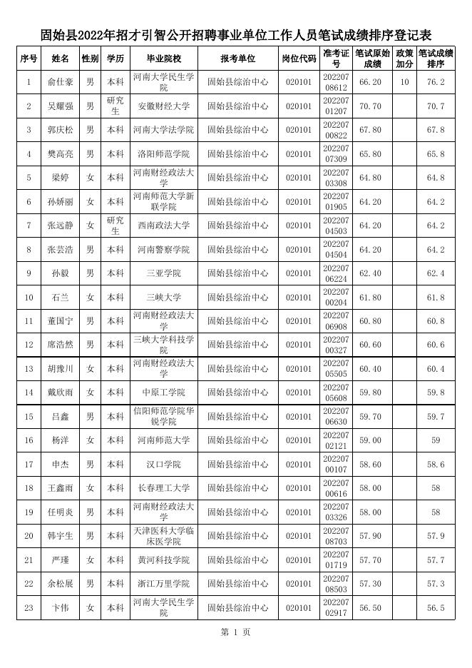 固始县2022年招才引智公开招聘事业单位工作人员笔试成绩排序.xls