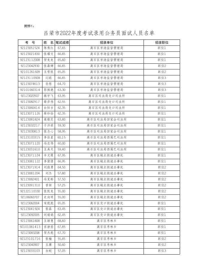 附件1:吕梁市2022年度考试录用公务员面试人员名单.xls