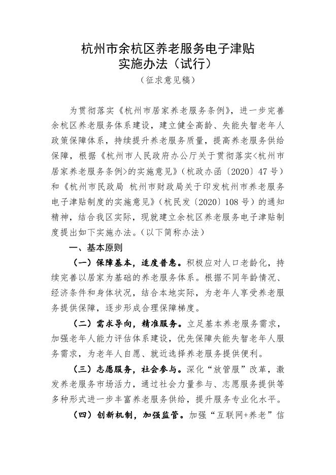 《杭州市余杭区养老服务电子津贴实施办法(试行)》(征求意见稿).doc