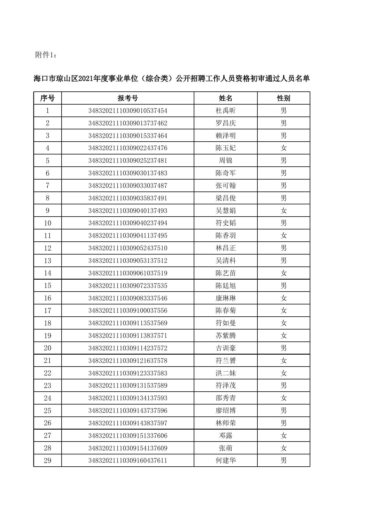 附件1:海口市琼山区2021年度事业单位(综合类)公开招聘工作人员资格初审通过人员名单.xls