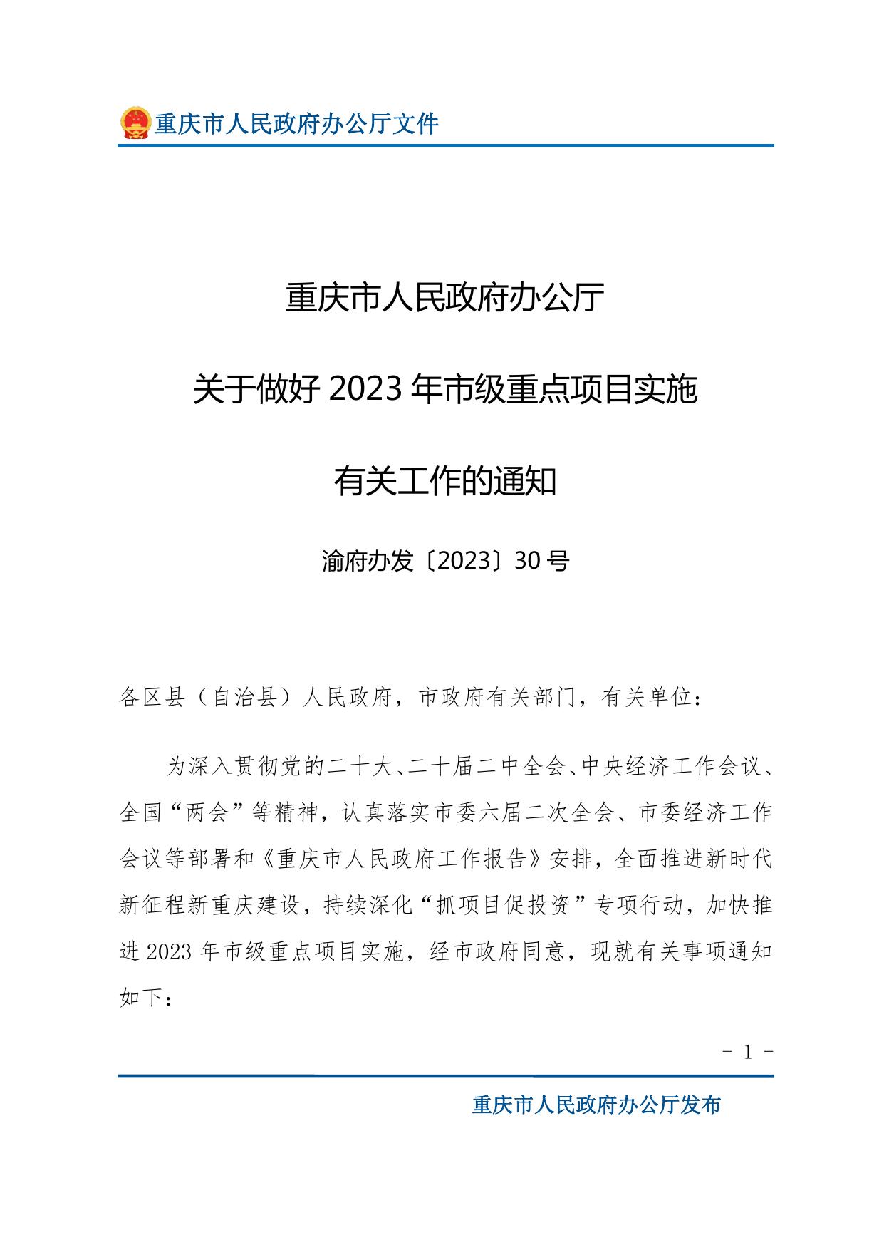 重庆市人民政府办公厅关于做好2023年市级重点项目实施有关工作的通知.pdf