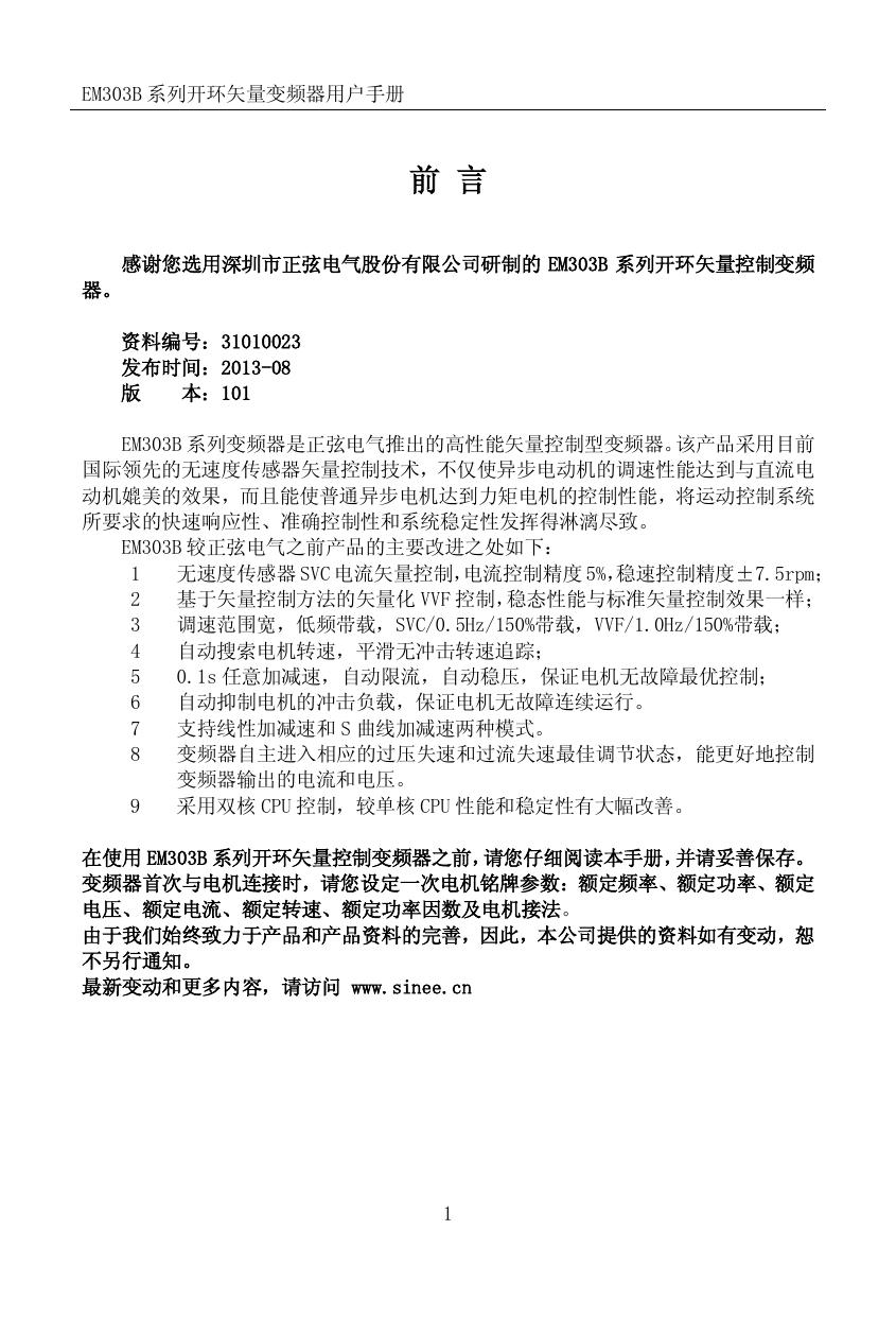 正弦EM303B-030G037P-3变频器使用说明书
