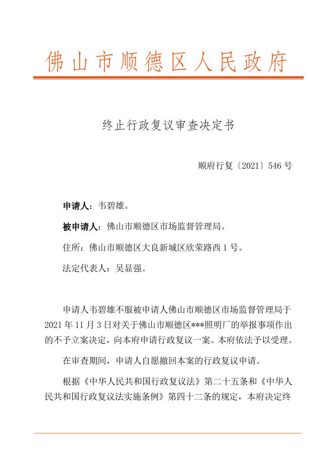 顺府行复〔2021〕546号 佛山市顺德区市场监督管理局举报事项不予立案告知案.docx