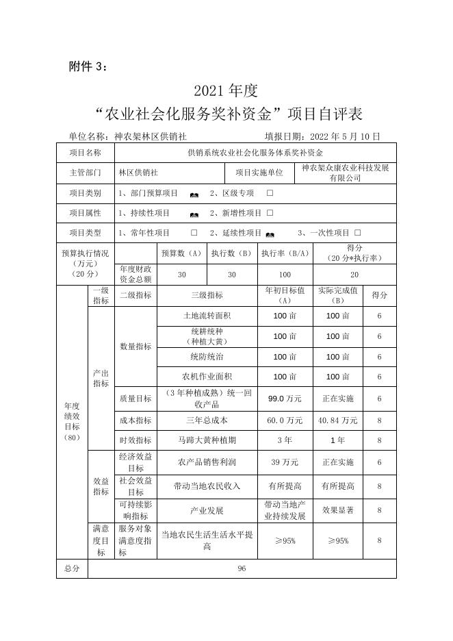 附件3:林区供销社2021年度“农业社会化服务奖补资金”项目自评表.doc