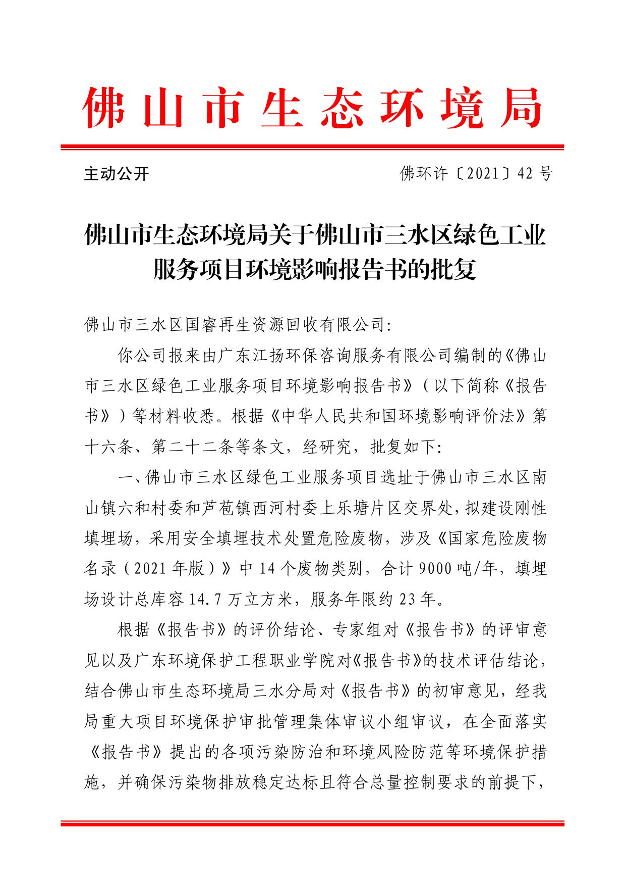 佛环许〔2021〕42号 佛山市生态环境局关于佛山市三水区绿色工业服务项目环境影响报告书的批复.pdf