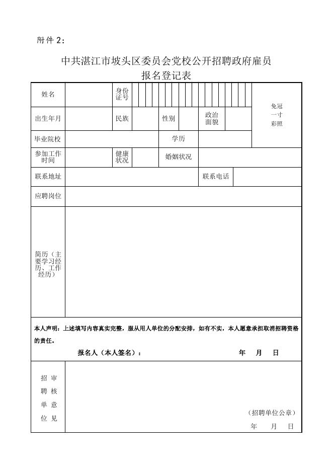 附件2 湛江市坡头区委员会党校公开招聘政府雇员报名登记表.doc