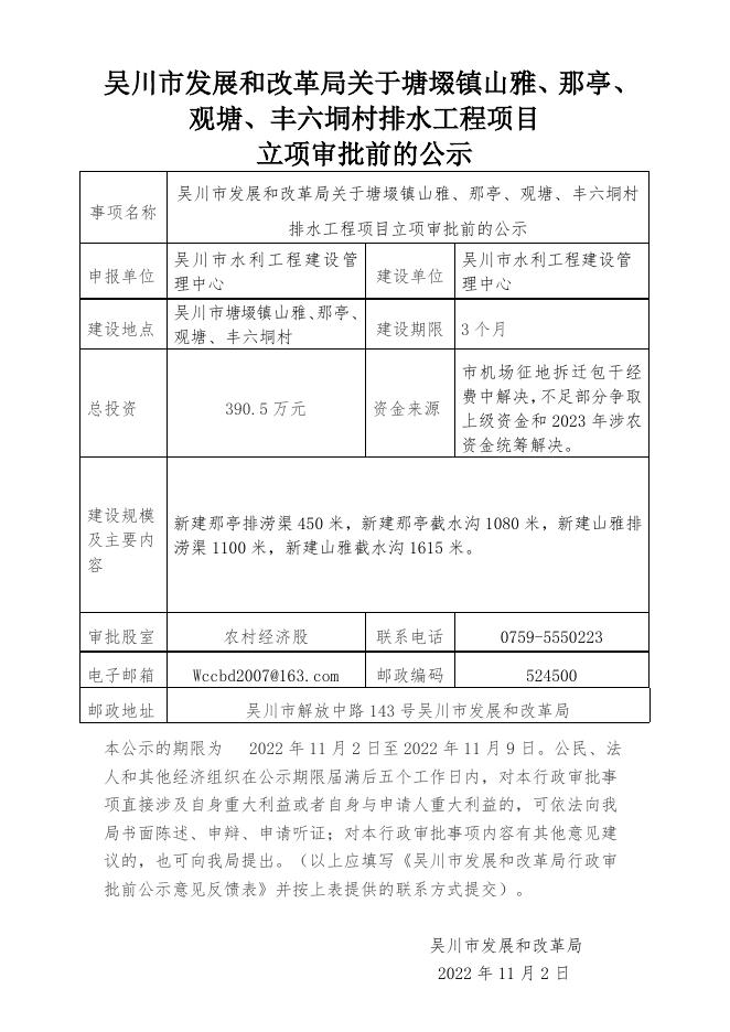 吴川市发展和改革局关于塘㙍镇山雅、那亭、观塘、丰六垌村排水工程项目立项审批前的公示.docx