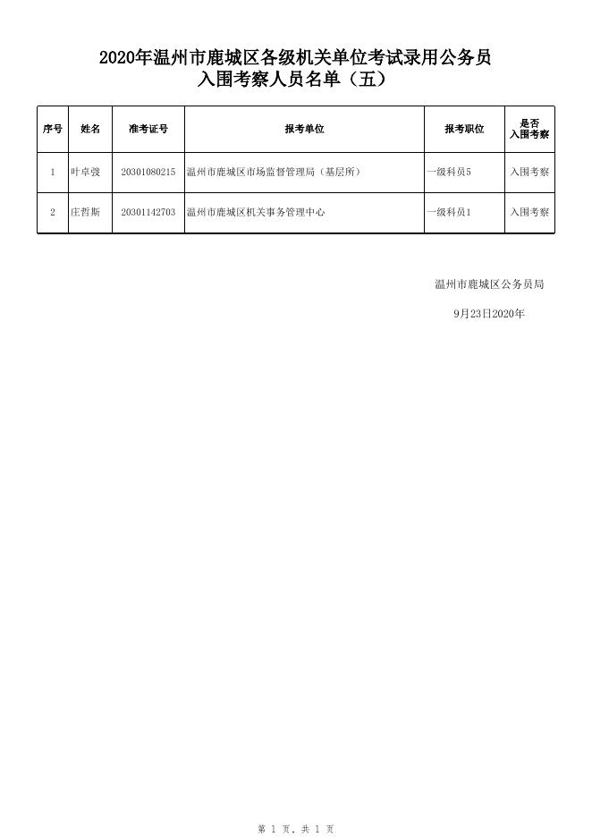 2020年温州市鹿城区各级机关单位考试录用公务员入围考察人员名单(五).xlsx