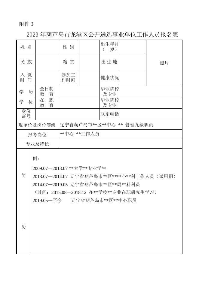 附件2 2023年葫芦岛市龙港区公开遴选事业单位工作人员报名表.doc