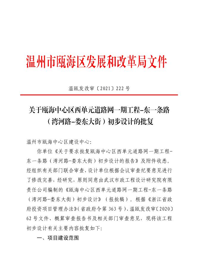 附件下载:温瓯发改审〔2021〕222 号关于瓯海中心区西单元道路网一期工程-东一条路 (湾河路-娄东大街)初步设计的批复.pdf