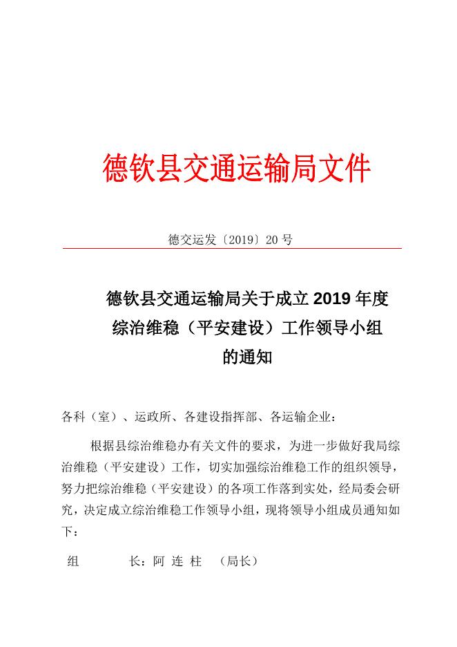 德钦县交通运输局关于成立2019年度综治维稳(平安交通)工作领导小组的通知——德交运发【2019】20号.docx