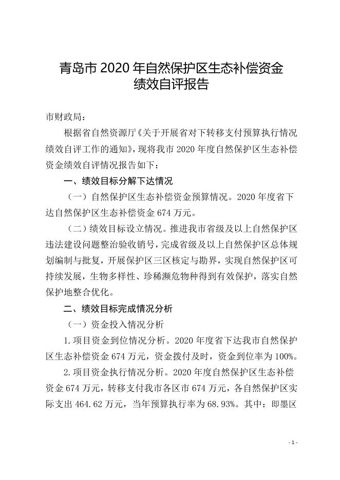 青岛市2020年自然保护区生态补偿资金绩效自评报告.docx