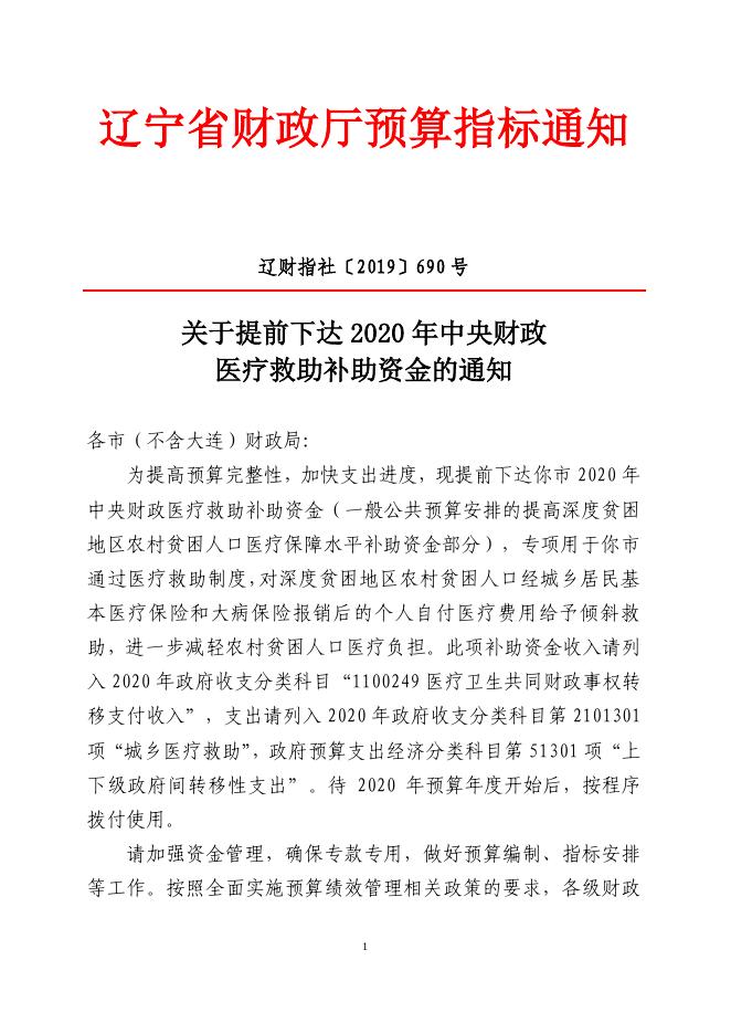 辽财指社【2019】690关于提前下达2020年中央财政医疗救助补助资金的通知.pdf