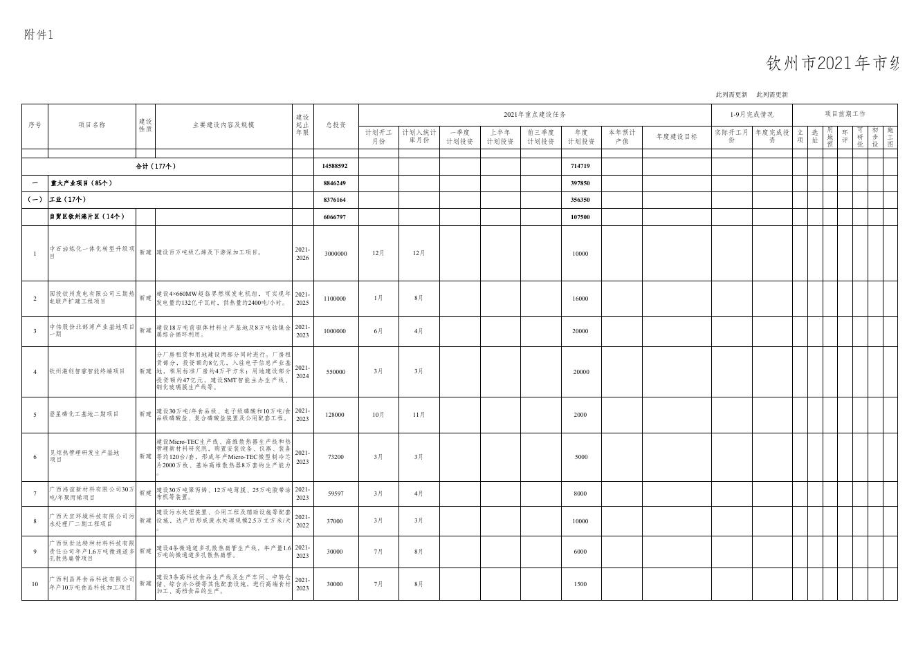 钦州市2021年市级重大项目推进计划表 9月.xls