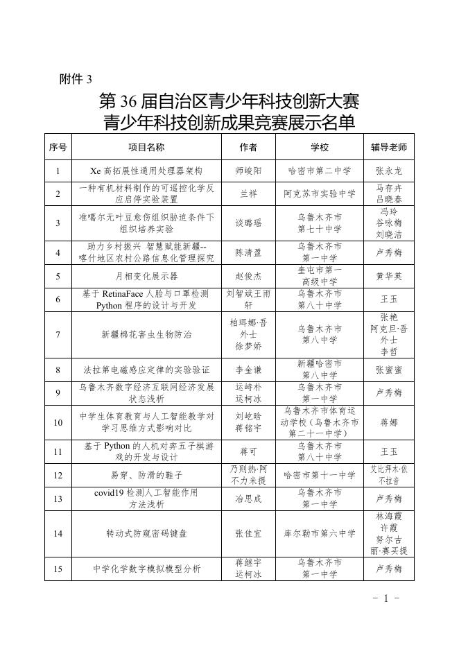 第36届自治区青少年科技创新大赛青少年科技创新成果竞赛展示名单.doc