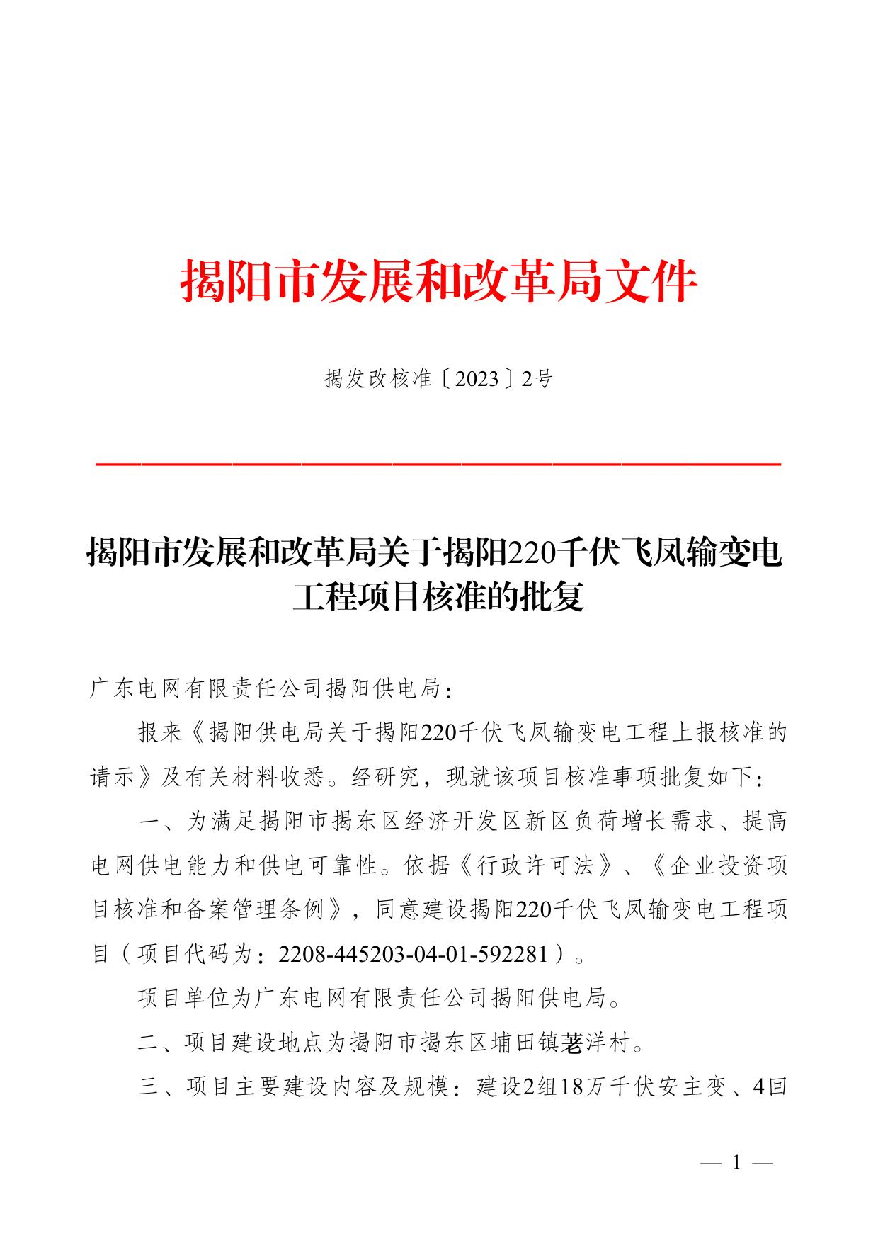 揭阳市发展和改革局关于揭阳220千伏飞凤输变电工程项目核准的批复.pdf
