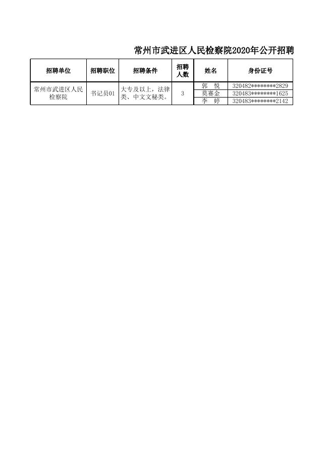 常州市武进区人民检察院2020年公开招聘书记员拟聘用人员名单.xlsx