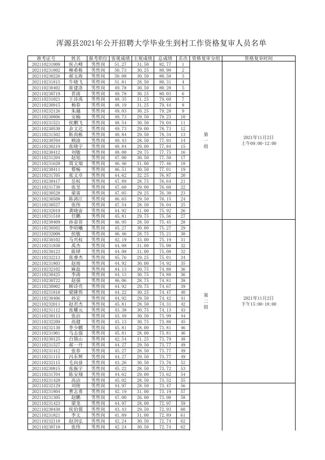 附件2:浑源县2021年公开招聘大学毕业生到村工作资格复审人员名单(男性岗).xlsx