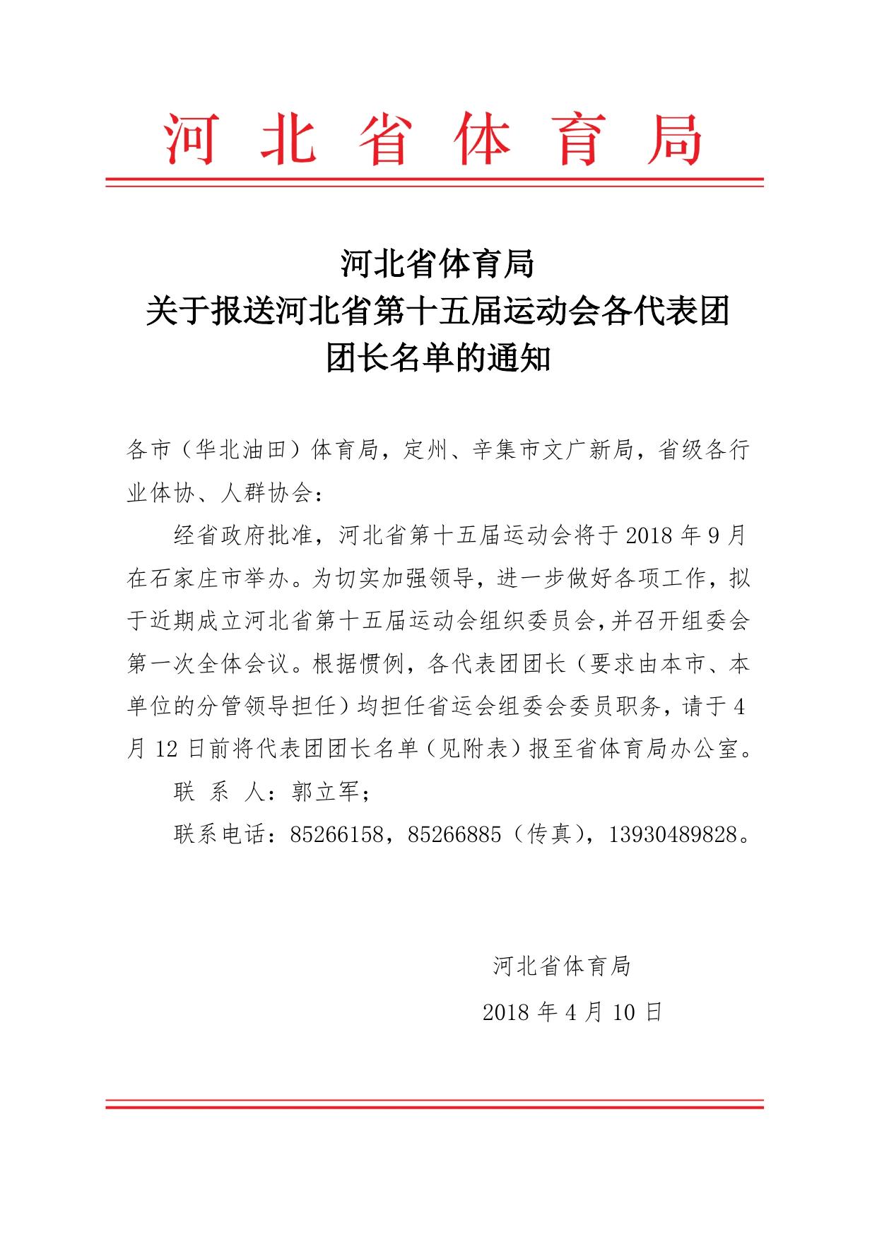 关于报送河北省第十五届运动会各代表团团长名单的通知_河北省体育局.docx