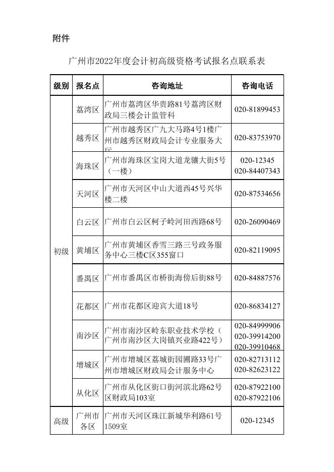 附件:广州市2022年度会计初高级资格考试报名点联系表.xls