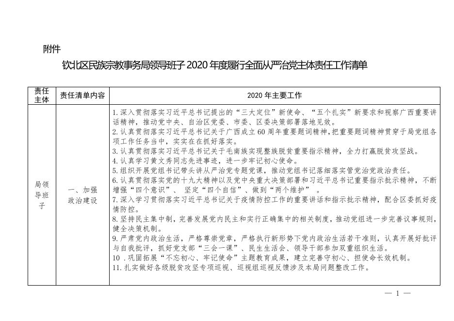 钦北区民宗局2020年度履行全面从严治党主体责任工作清单.doc