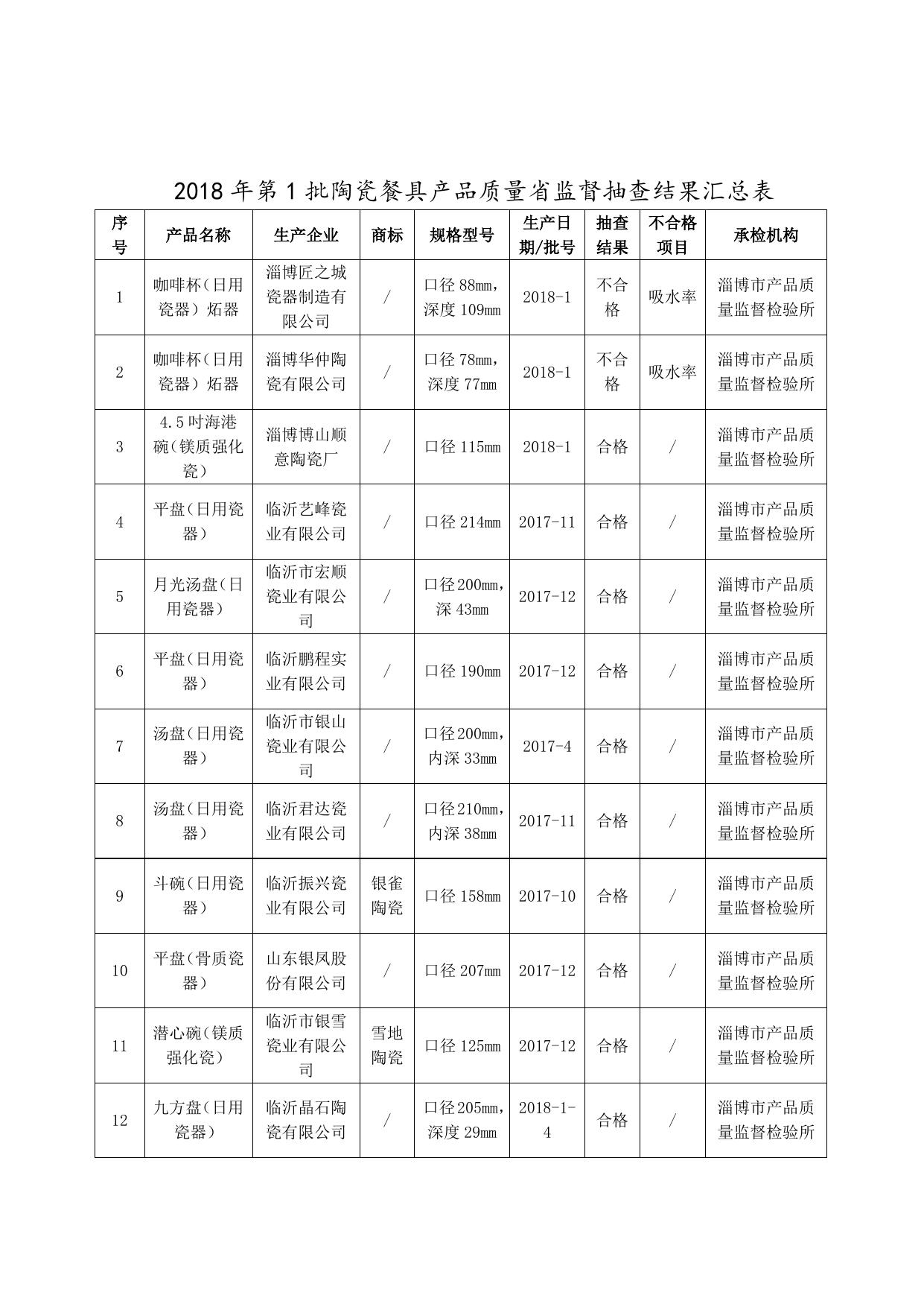 2018年第1批陶瓷餐具产品质量省监督抽查结果汇总表.docx