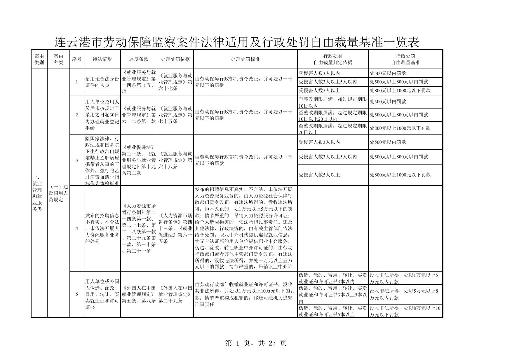 附件:连云港市劳动保障监察案件法律适用及行政处罚自由裁量基准一览表(1).xlsx