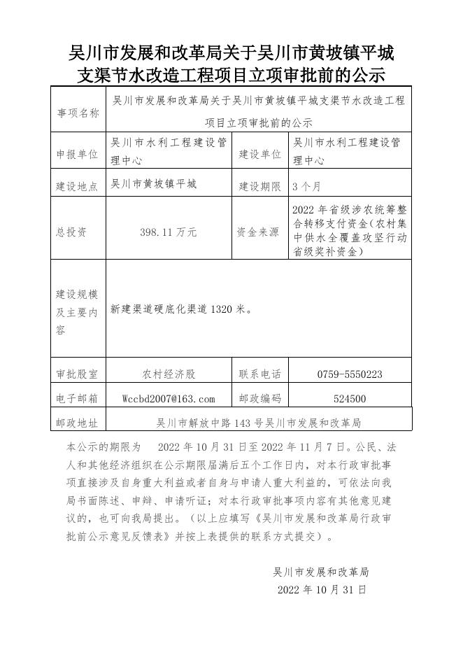 吴川市发展和改革局关于吴川市黄坡镇平城支渠节水改造工程项目立项审批前的公示.docx