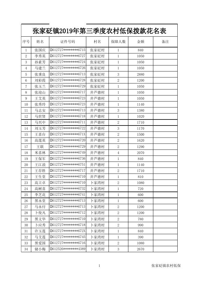 张家砭镇2019年第三季度农村低保拨款花名表.xlsx