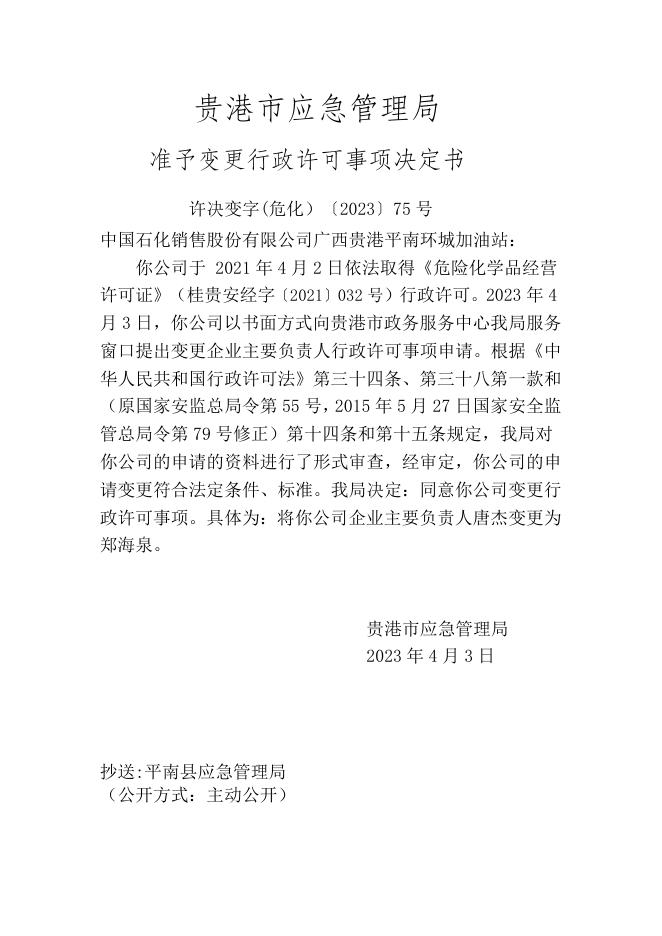 贵港市应急管理局准予变更行政许可事项决定书(许决变字(危化)〔2023〕75号).doc