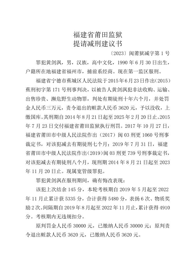 福建省莆田监狱2023年1月罪犯减刑(假释)建议书.doc