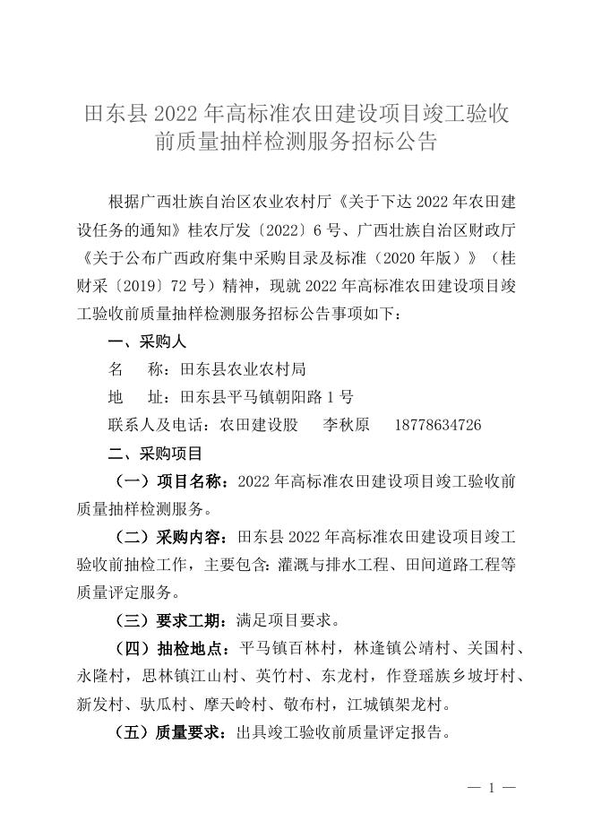 田东县2022年高标准农田建设项目竣工验收前质量抽样检测服务招标公告(1).docx