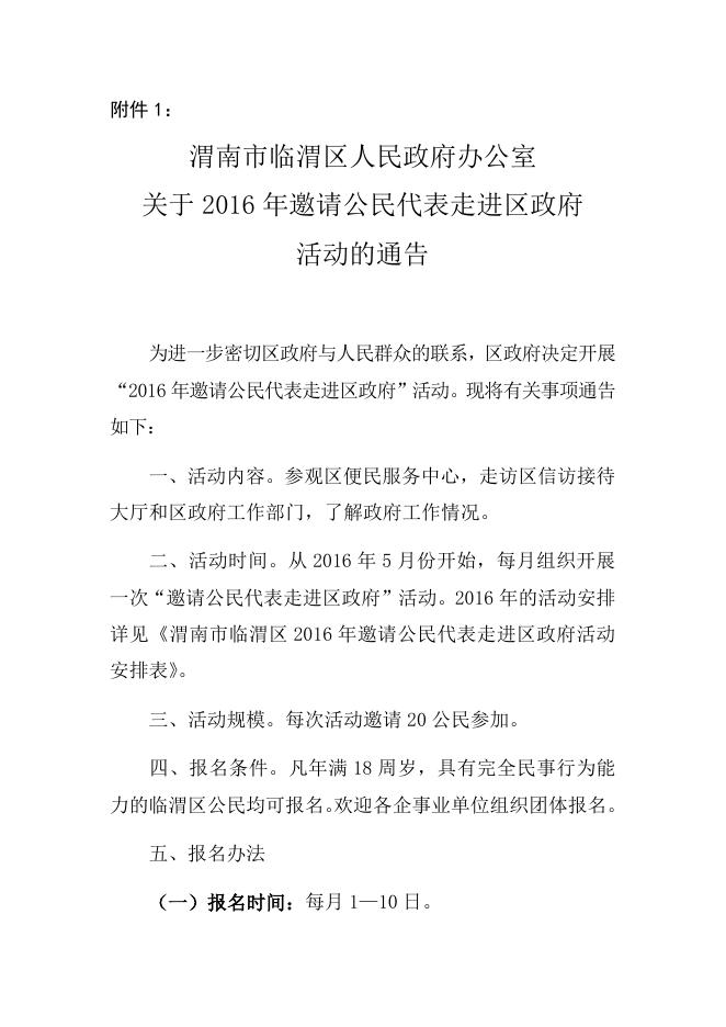 关于2016年邀请公民代表走进区政府活动的通告.docx