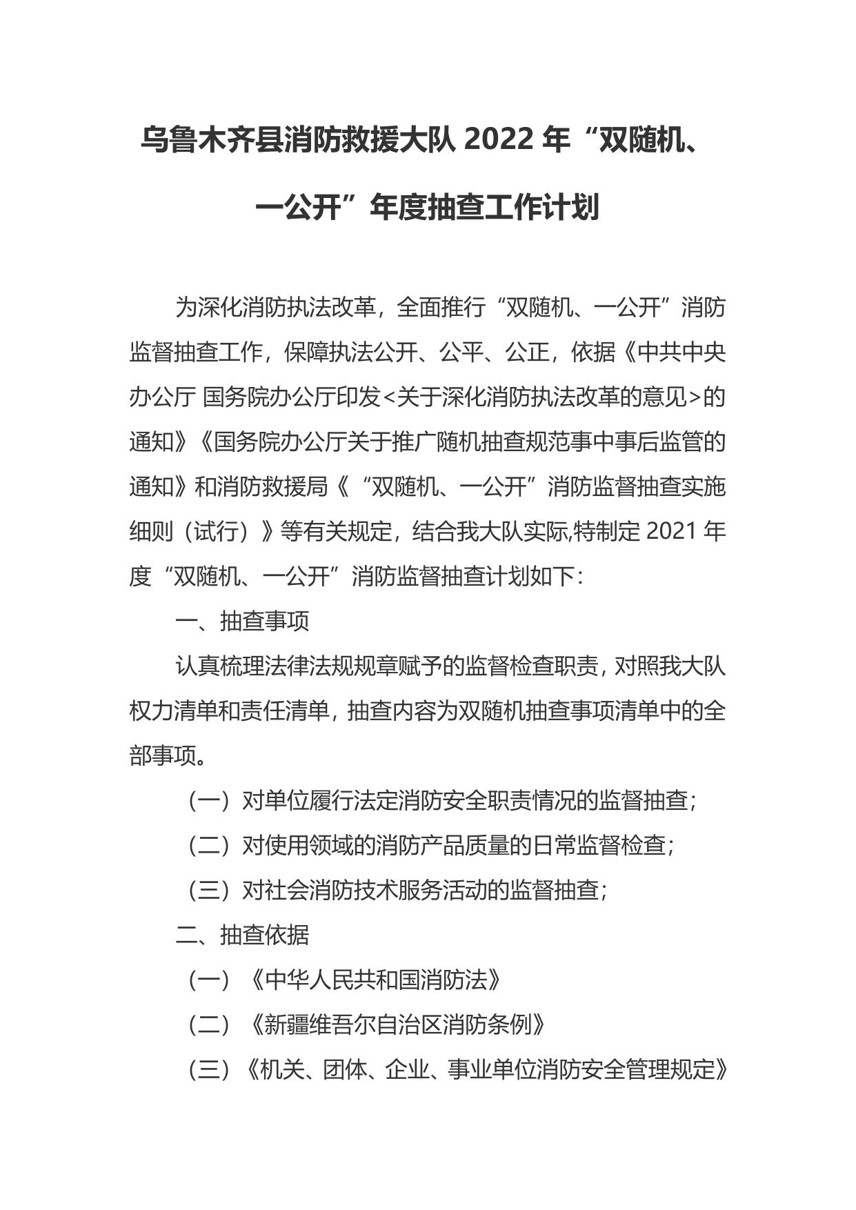 乌鲁木齐县消防救援大队2022年双随机一公开抽查计划.docx