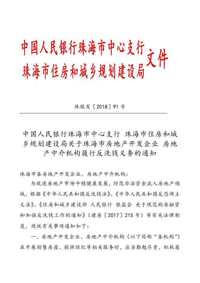 中国人民银行珠海市中心支行 珠海市住房和城乡规划建设局关于珠海市房地产开发企业、房地产中介机构履行反洗钱义务的通知.doc